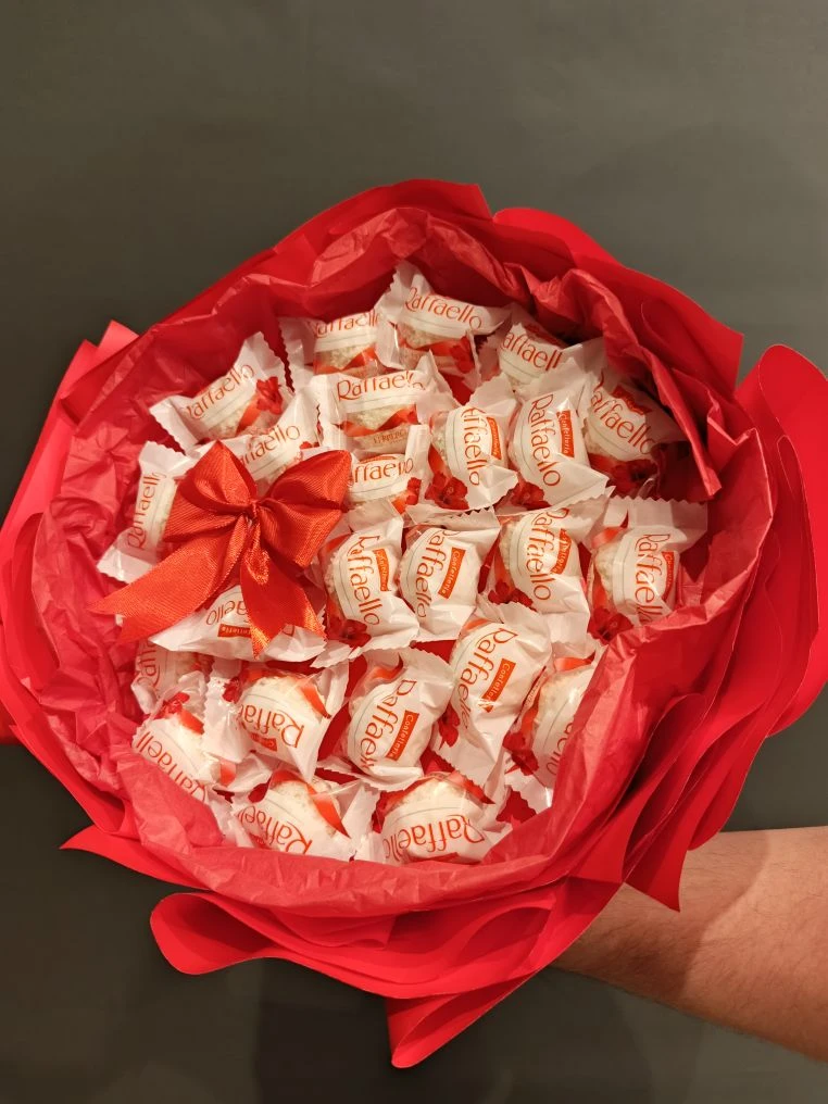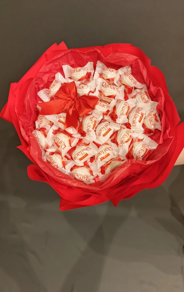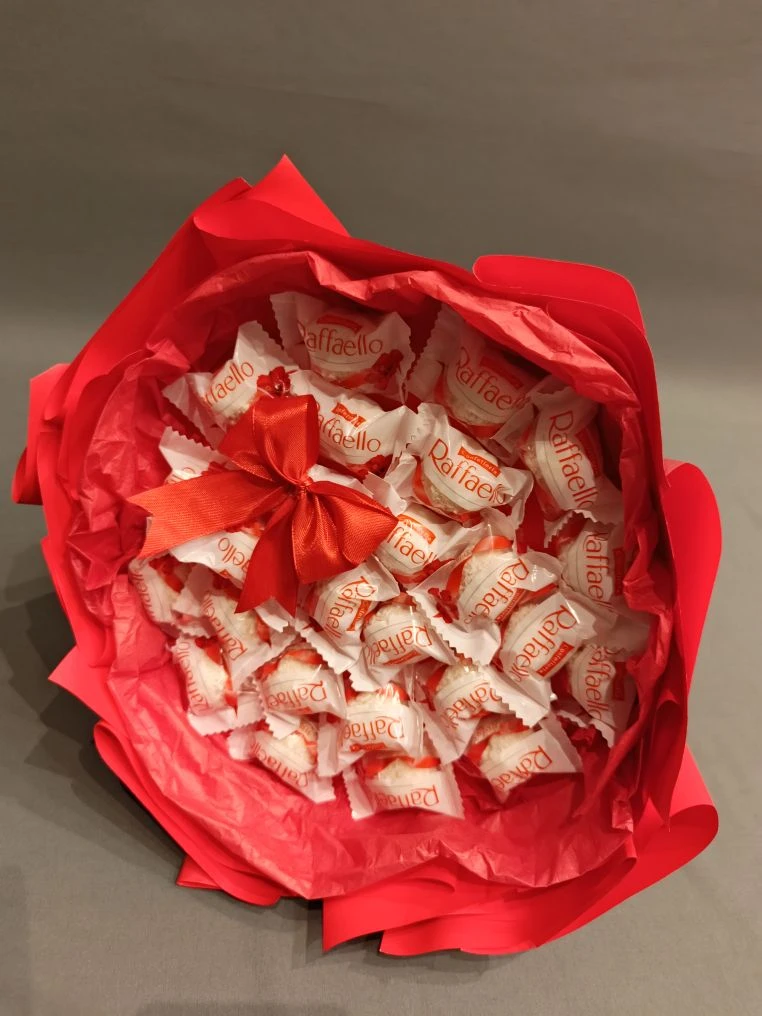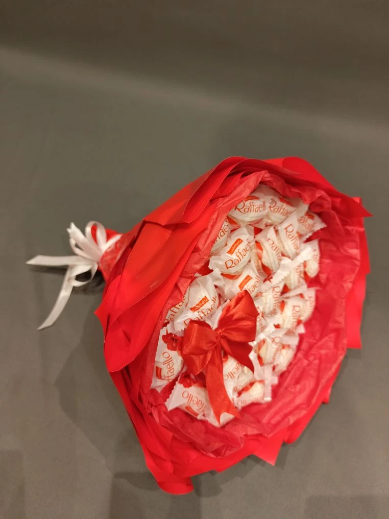 Сладкий букет № 7 «Raffaello: цветочная композиция в ярко-красном букете»