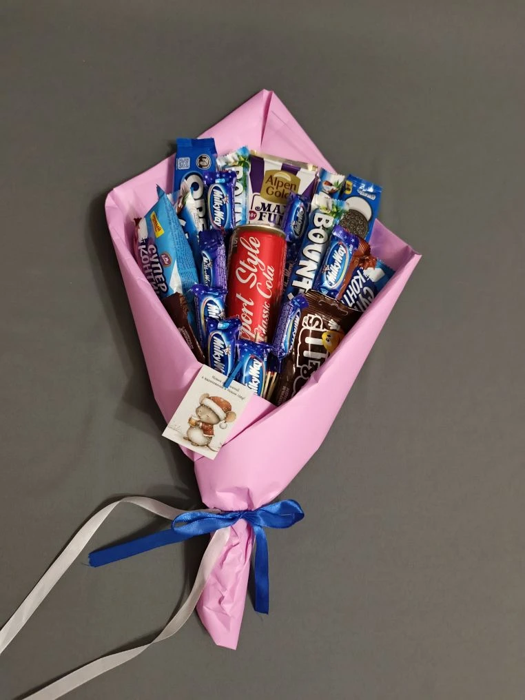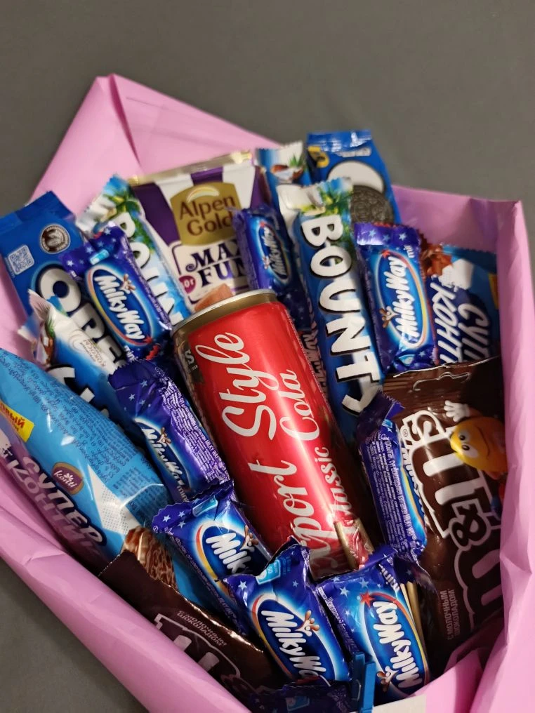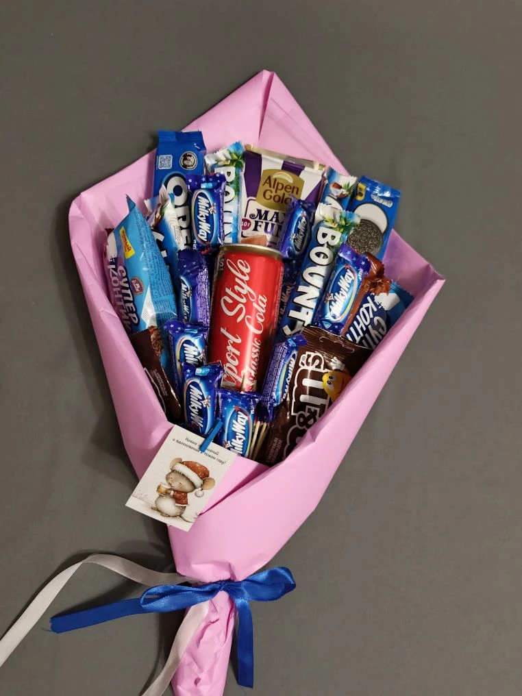 Сладкий букет № 12 «Розовое чудо» — изысканная композиция из 23 единиц любимых лакомств в элегантной розовой упаковке. Идеальный подарок для тех, кто ценит разнообразие вкусов и стильное оформление! В составе букета: Max Fun (1 плитка) — молочный шоколад с хрустящим печеньем, жевательным мармеладом и карамелью («эффект лёгкого взрыва»); Bounty (4 батончика) — нежная кокосовая начинка в молочном шоколаде; Oreo (2 упаковки) — хрустящее печенье с кремовой начинкой; «Супер Контик» (шоколадное суфле, 2 упаковки) — воздушное суфле с насыщенным шоколадным вкусом; M&M’s (драже в молочном шоколаде, 2 упаковки) — яркие драже с хрустящей оболочкой и тающей начинкой; Milky Way (мини‑батончики, 11 шт.) — карамель и шоколад в компактной форме; Export Style Classic Cola (1 банка) — освежающий напиток, гармонично дополняющий сладкий ассортимент. Особенности оформления: внешняя упаковка — стильная плёнка розового цвета; внутренняя упаковка — прозрачная плёнка (позволяет рассмотреть каждый элемент); атласный бант — утончённое декоративное украшение; атласная лента для подвязки — завершает образ букета. Почему стоит выбрать «Розовое чудо»: богатый состав — 23 единицы товара, включая шоколад, печенье, драже и напиток; разнообразие текстур и вкусов — от хрустящих до воздушных и тающих во рту; праздничное оформление — розовая упаковка и атласные элементы создают настроение; универсальность — подходит для дня рождения, юбилея, благодарности или просто для поднятия настроения. Цена: 3 600 ₽ — и море вкусовых впечатлений в одном букете! Профессиональная доставка по Коломне осуществляется нашими опытными курьерами. Мы гарантируем аккуратное и бережное обращение с заказом на всех этапах доставки. Свяжитесь с менеджером в любом удобном для вас мессенджере: WhatsApp, Telegram, сообществе «ВКонтакте» для быстрой консультации.